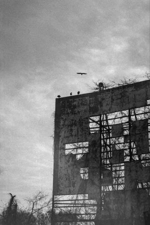Four turkey buzzards await their next easy meal atop an abandoned drive-in theater screen. (captured on 35mm film in Clanton, AL)